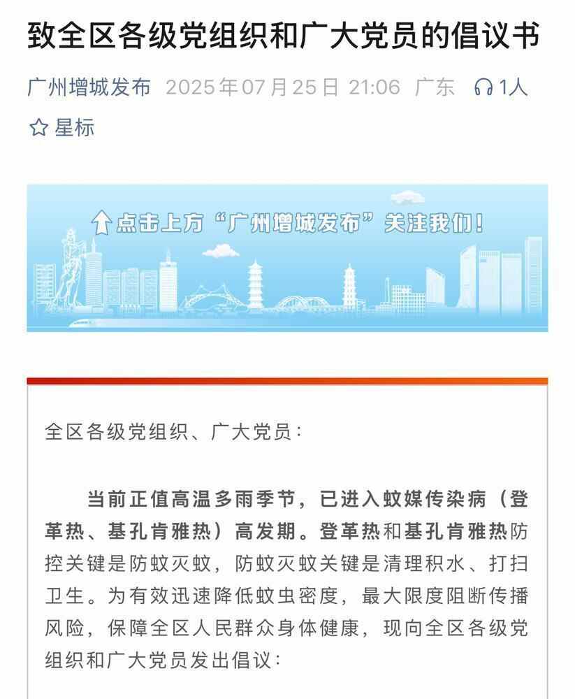 记者梳理发现,截至7月25日23时30分,广州黄埔、从化、增城、花都、白云、海珠、荔湾、天河等区,从下午开始陆续发布了《致全区各级党组织和广大党员的倡议书》,或标题类似的倡议书。根据倡议书内容,广州多区已号召各级党组织和广大党员积极参与蚊媒传染病防控工作。