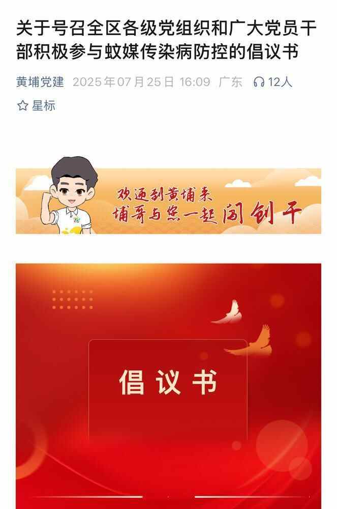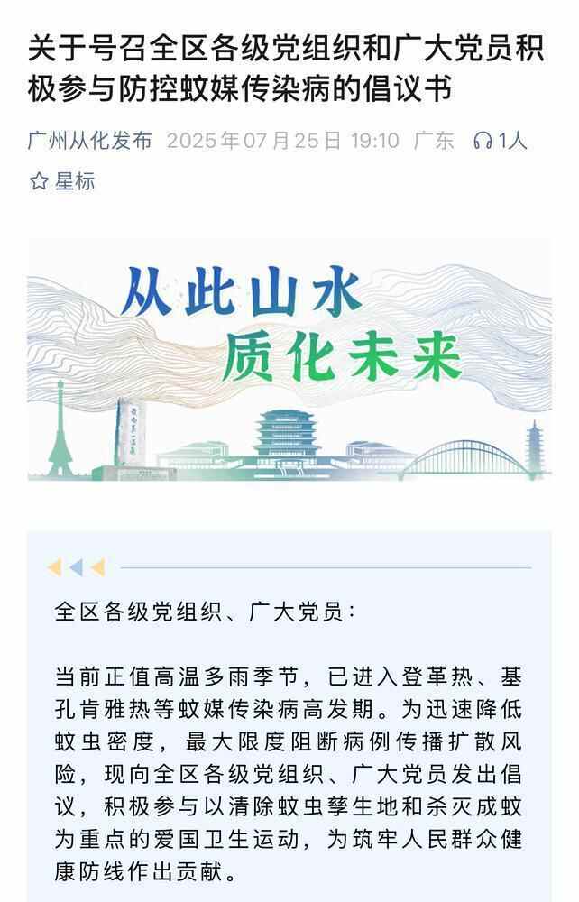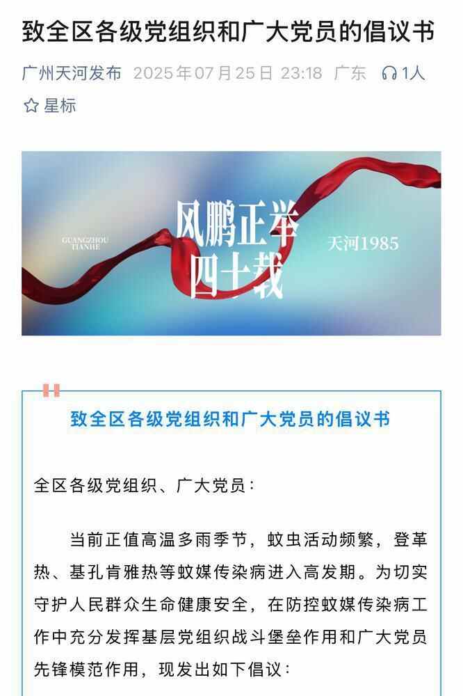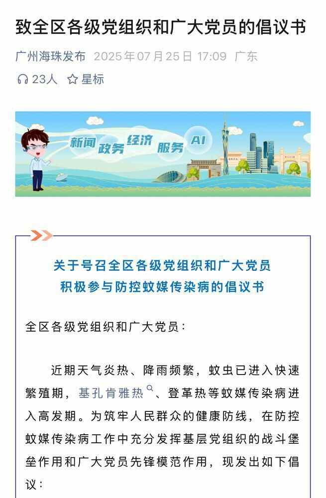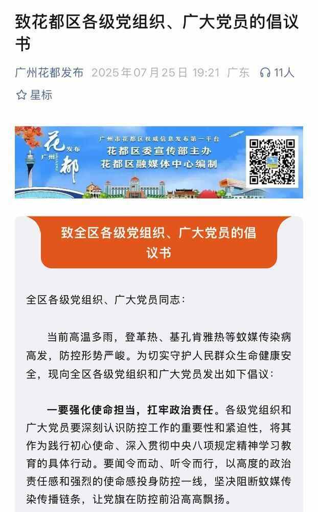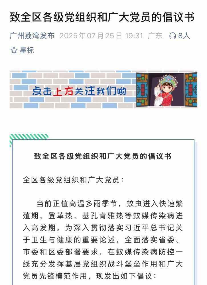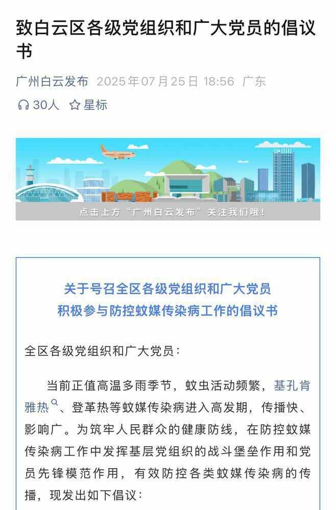 7月25日下午至晚上,广州多个行政区,纷纷通过各区发布号、党建发布号等方式,倡议区内各级党组织和广大党员积极参与蚊媒传染病防控。