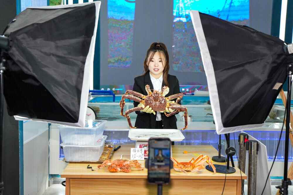 2024年9月20日,在吉林省珲春市的帝王蟹保税店内,工作人员进行网络直播售卖帝王蟹。新华社记者 许畅 摄