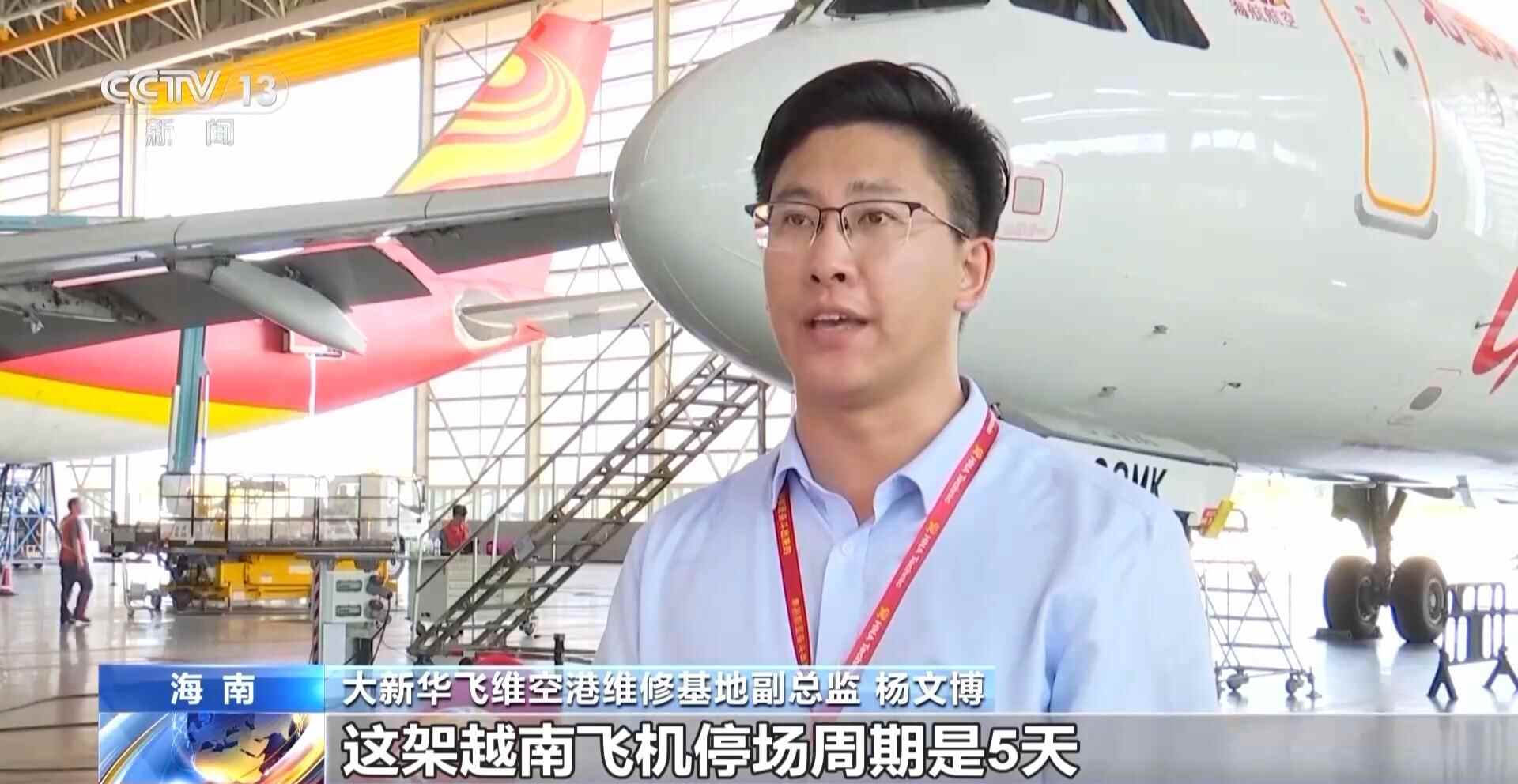 大新华飞维空港维修基地副总监 杨文博:这架越南飞机停场周期是5天,享受进境维修免保证金、进口维修航材保税等海南自贸港优惠政策。
