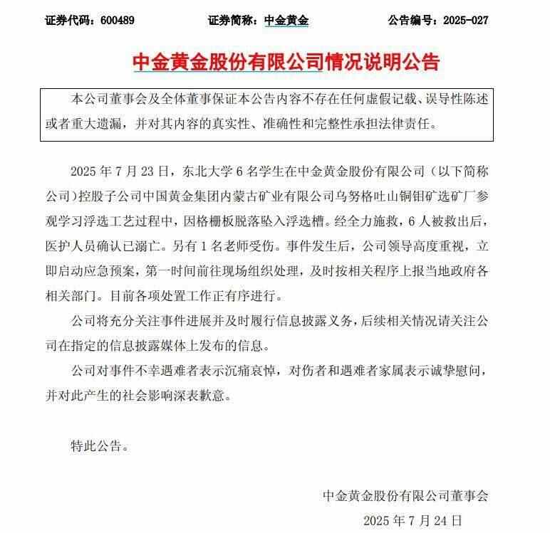 据新华社消息,7月23日10时20分许,东北大学6名学生在中国黄金集团内蒙古矿业有限公司乌努格吐山铜钼矿选矿厂参观学习浮选工艺过程中,因格栅板脱落坠入浮选槽。经全力施救,6人被救出后,医护人员确认已溺亡。另有1名老师受伤。目前,属地党委政府、东北大学、中国黄金集团有限公司正在开展善后处置工作。
