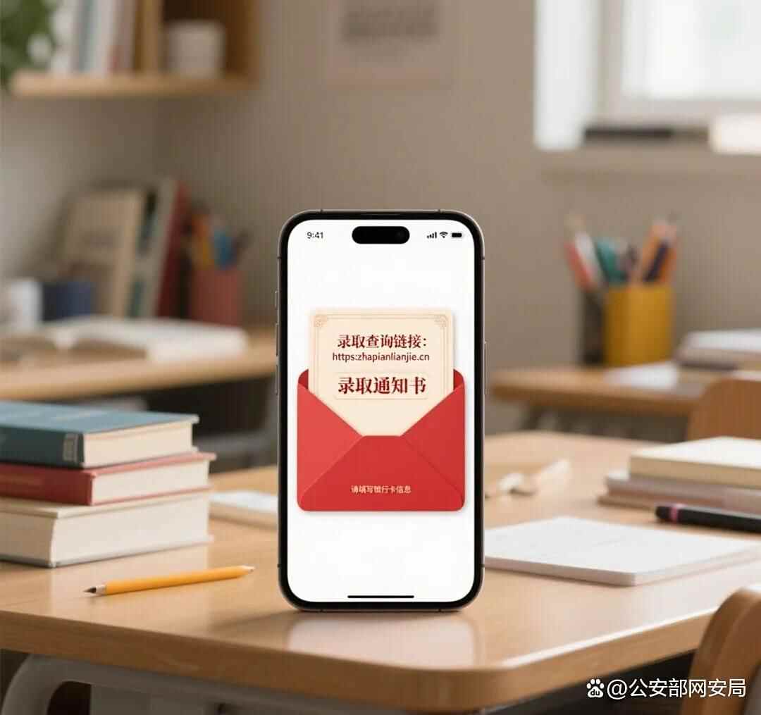 陷阱手法: 收到看似正式的“录取通知书”短信或邮件,要求点击链接查询详情或支付“录取确认费。