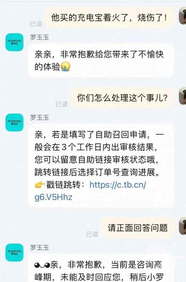 7月23日,记者拨打了罗马仕全国服务热线,语音提醒咨询处于繁忙状态,始终无人工接听。又联系了网上罗马仕旗舰店的客服,客服文字回复:若是填写了自助召回申请,一般会在3个工作日内出审核结果,您可以留意自助链接审核状态哦……