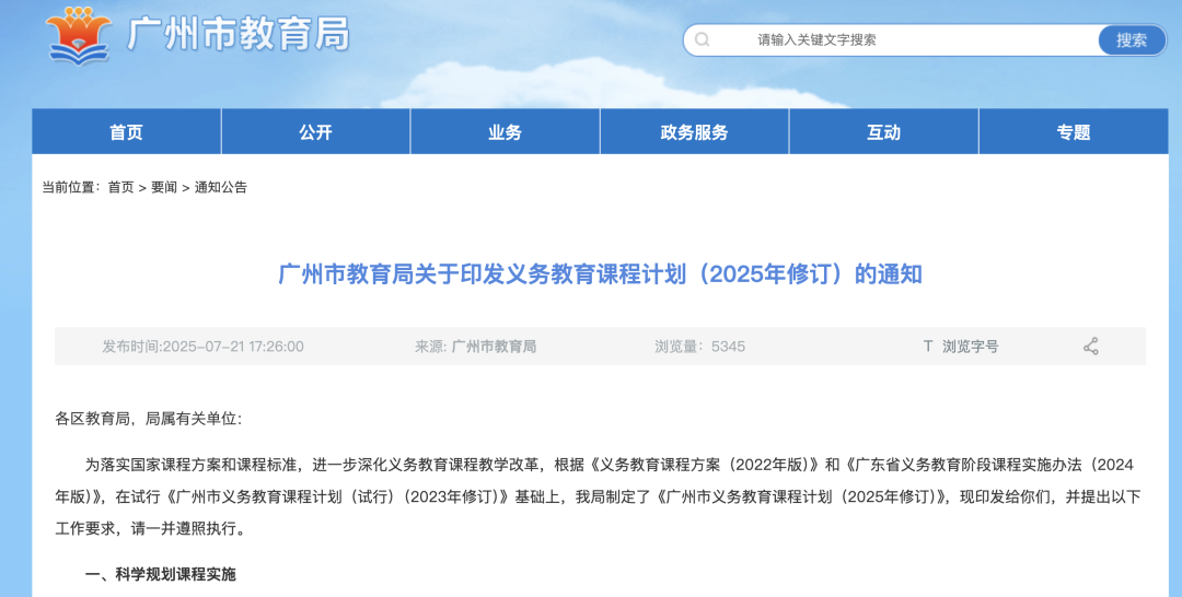 7月21日,广州市教育局官网发布关于印发义务教育课程计划(2025年修订)的通知,明确:
