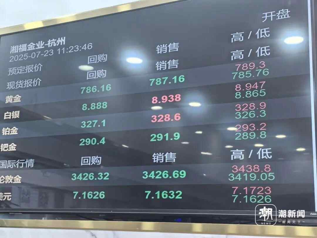 “金价最近一直在高位震荡,不是急需的顾客都在观望,想等回落一点再出手,昨天金价再度上涨,让部分顾客期待落空。”杭州武林广场附近一家品牌金店店员说。