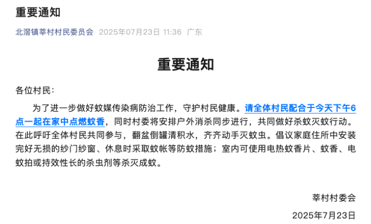 广东近期天气炎热、降雨频繁,蚊虫已进入快速繁殖期,发生基孔肯雅热疫情,登革热疫情也进入快速上升期。7月23日,广东佛山顺德区北滘镇莘村村民委员会发布全村点蚊香重要通知,其中“请全体村民配合于今天下午6点一起在家中点燃蚊香”,引发了众多网友的关注。
