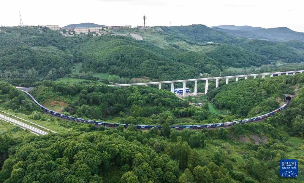 7月21日,一列满载家用电器的中欧班列驶出中国铁路哈尔滨局集团有限公司绥芬河站(无人机照片)。