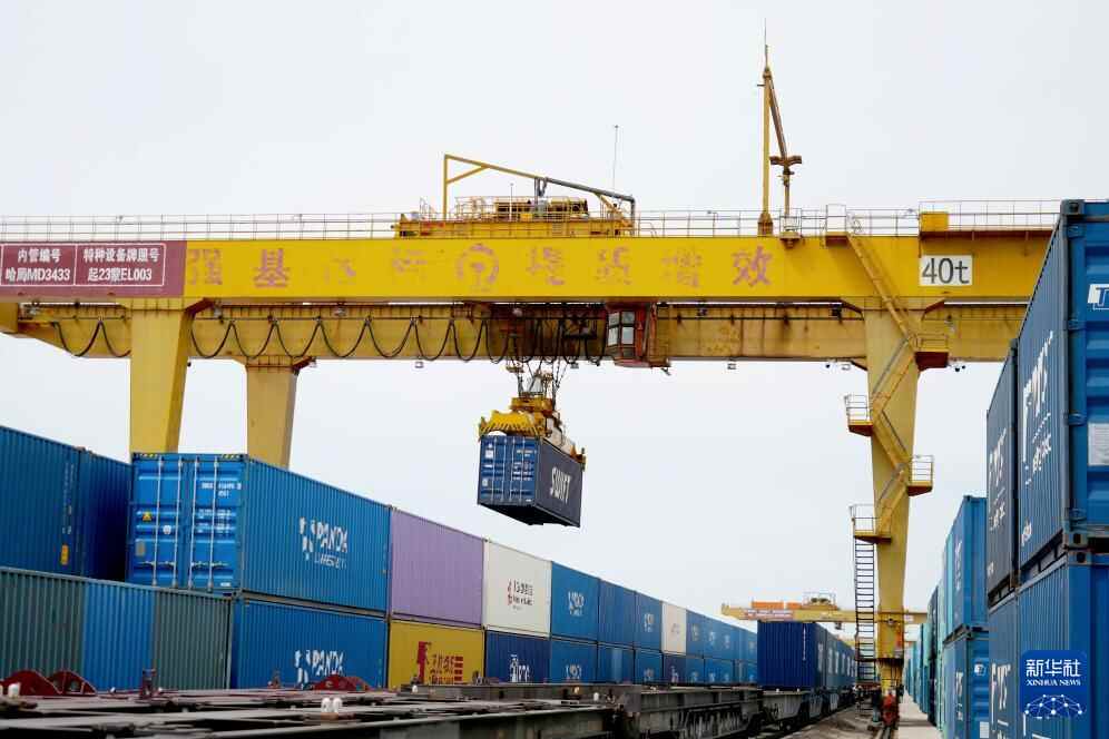 7月18日,中国铁路哈尔滨局集团有限公司满洲里站集装箱换装场,回程中欧班列在接受吊装作业。