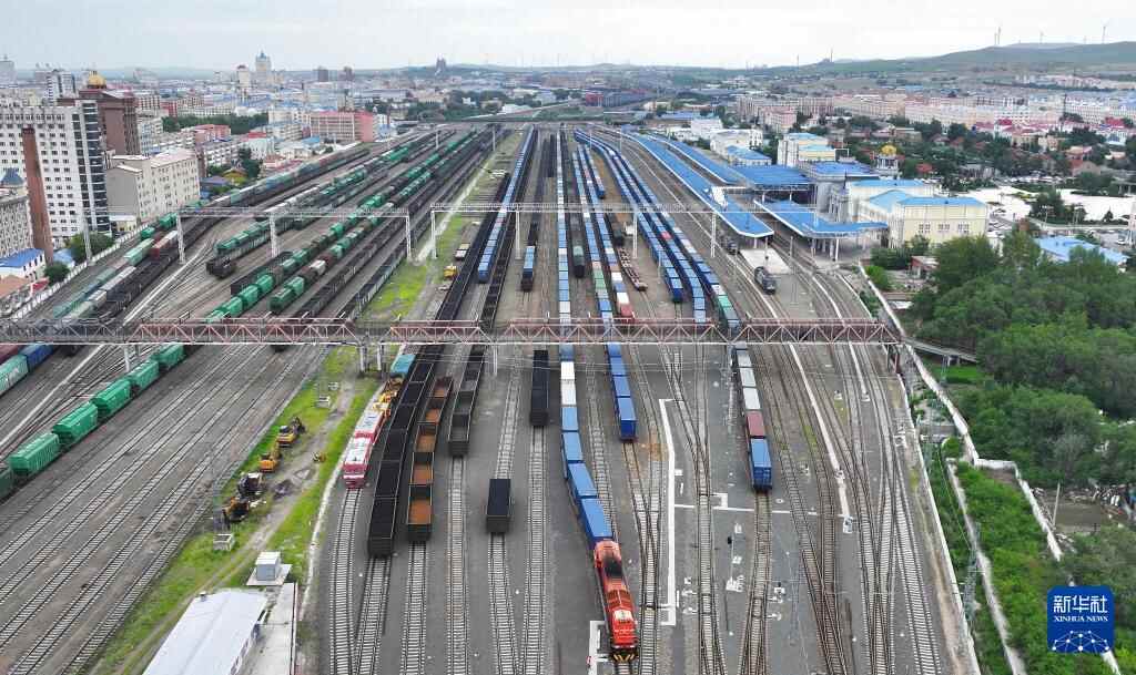 7月22日,中欧班列在中国铁路哈尔滨局集团有限公司满洲里站编组场等待发车(无人机照片)。