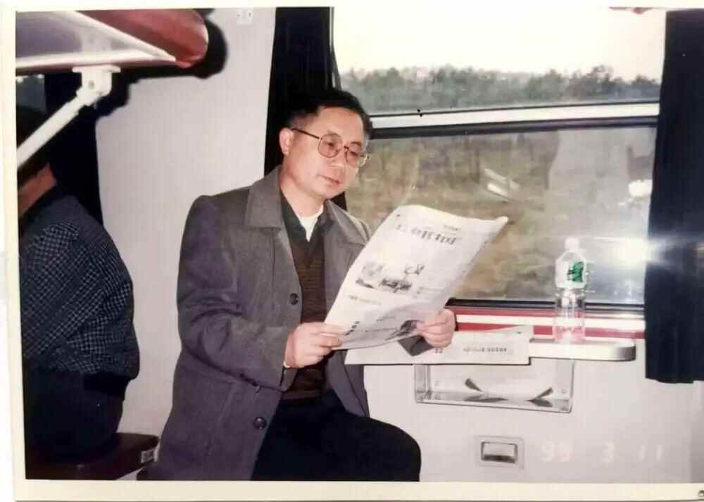 年轻时在火车上看报的吴海明。受访者供图