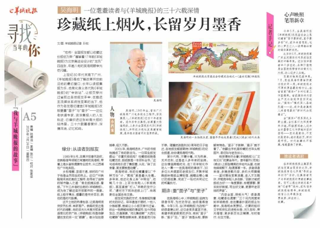 “内容全面,排版大气!读者满意,收藏者也满意!”三个月内两度来到羊城晚报,走在墨香扑面的报业长廊中,吴海明由衷赞叹。泛黄的铅印文字和恢弘的连版长卷,历久弥珍,荣光熠熠;更多新页也正铺展,与时偕行,长空万里。