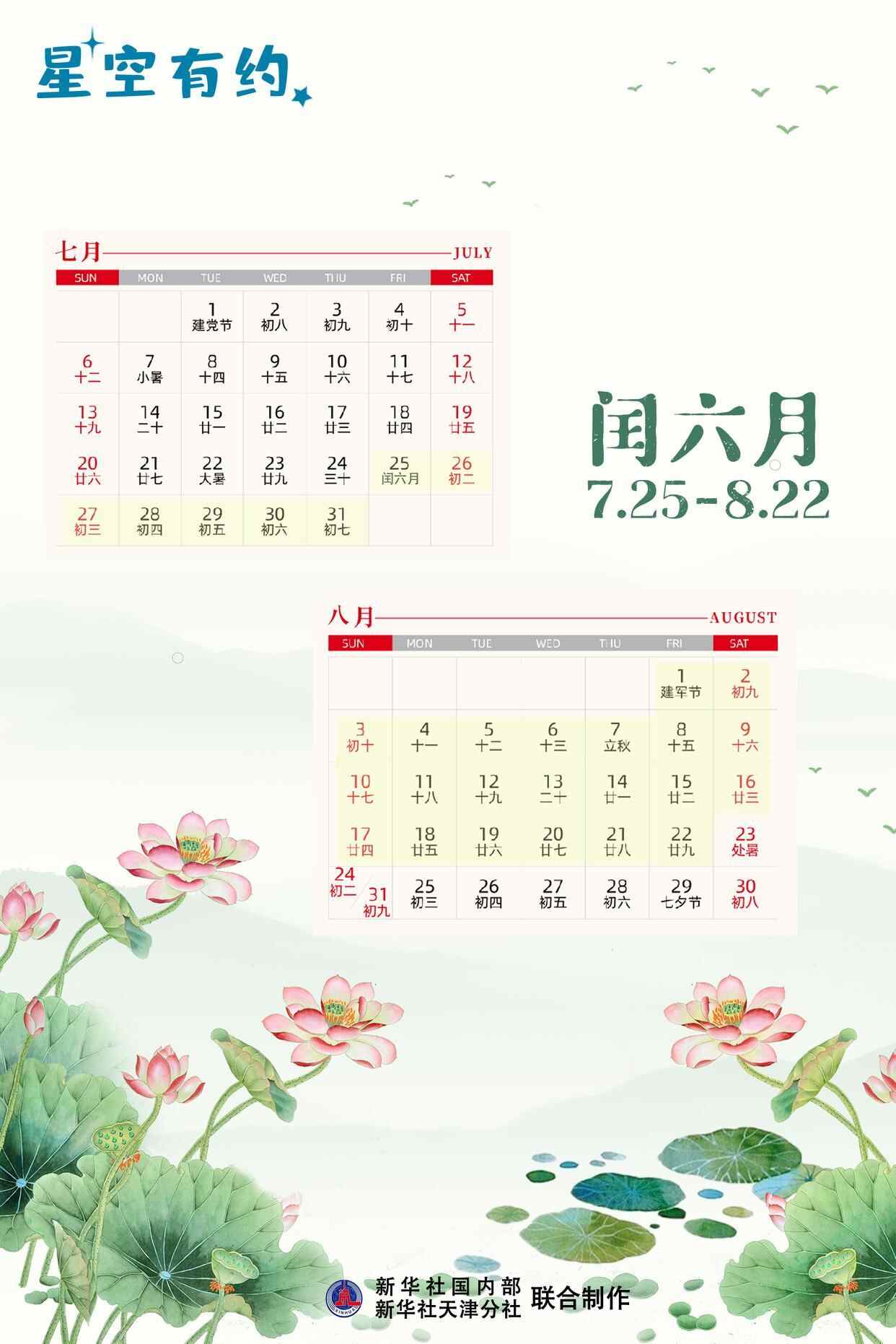 今年7月22日(农历六月二十八),是中气大暑,下一个中气处暑在8月23日(农历七月初一),这当中的7月25日至8月22日的农历月中只有一个节气立秋,没有中气,所以这个农历月就定为闰月。因为上一个月是六月,所以这个闰月就称为“闰六月”,共29天。