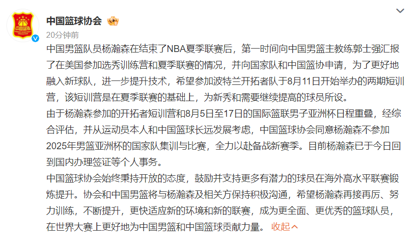 由于杨瀚森参加的开拓者短训营和8月5日至17日的国际篮联男子亚洲杯日程重叠,经综合评估,并从运动员本人和中国篮球长远发展考虑,中国篮球协会同意杨瀚森不参加2025年男篮亚洲杯的国家队集训与比赛,全力以赴备战新赛季。目前杨瀚森已于今日回到国内办理签证等个人事务。