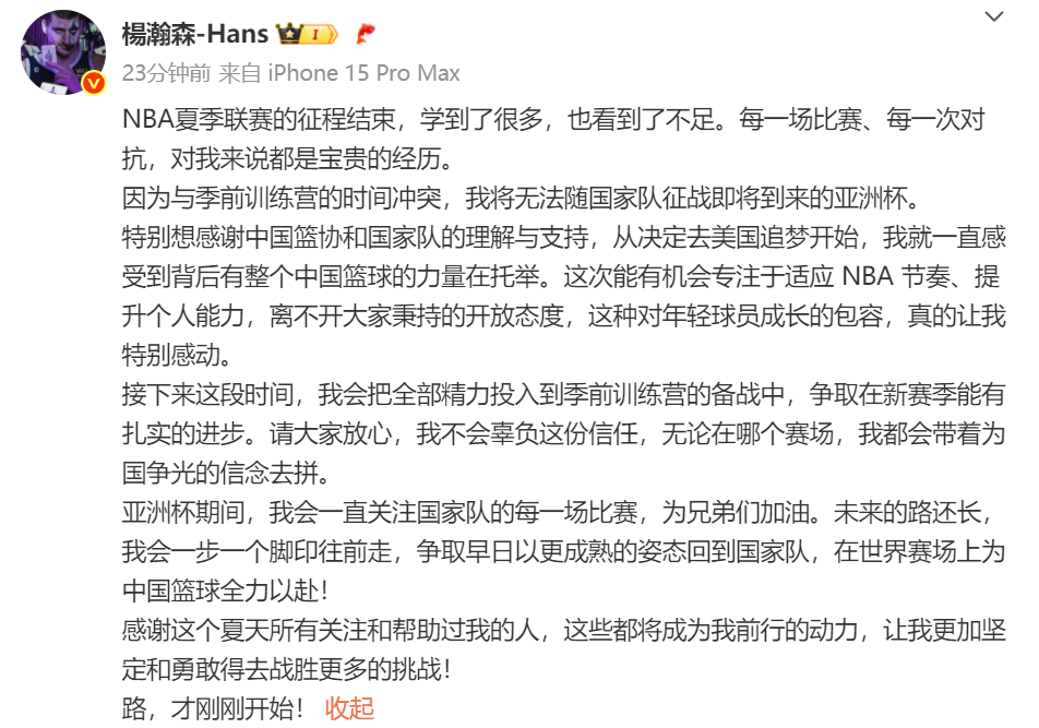 杨瀚森则通过个人微博回应:因为与季前训练营的时间冲突,我将无法随国家队征战即将到来的亚洲杯。
