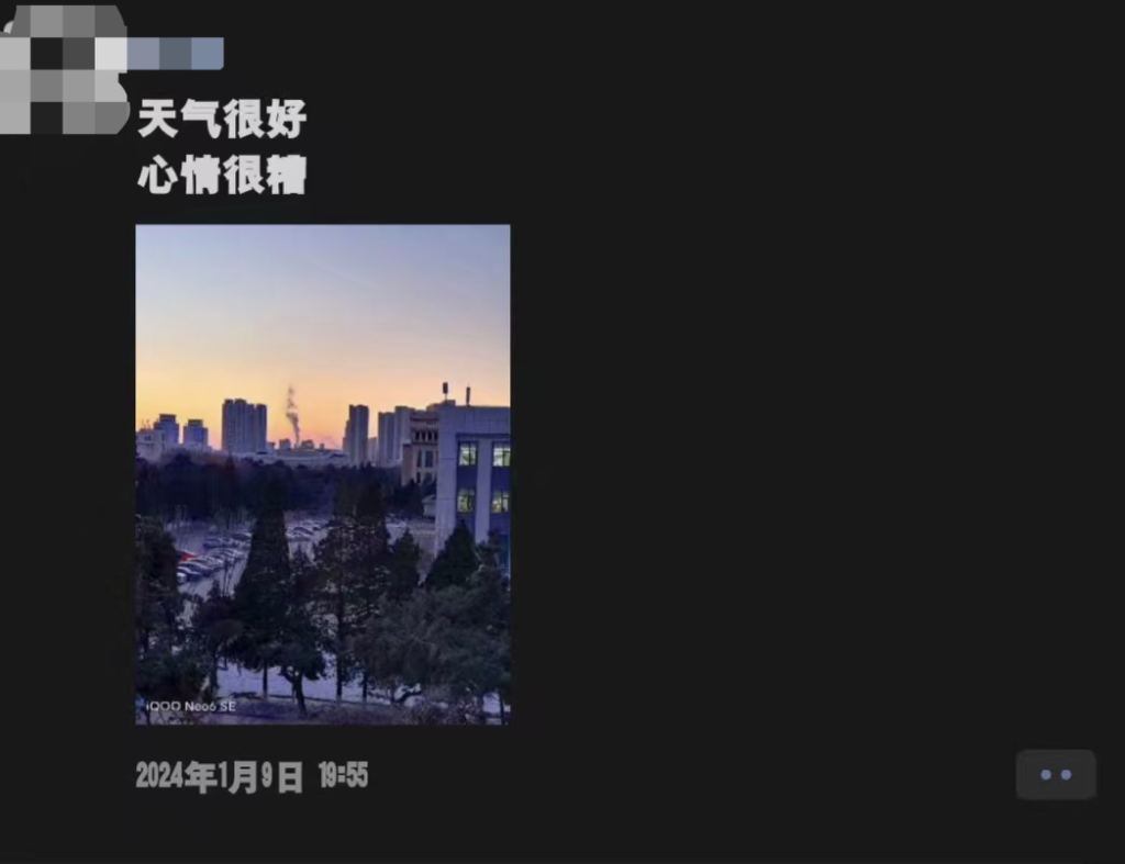 另一名女生告诉记者,刘林是其表哥。她和表哥的聊天记录停留在6月27日21时25分,她考上了理想的高中,表哥表扬她“厉害厉害”。刘林的朋友圈设置了三天可见,唯一一条置顶动态发布于2024年1月9日19时55分,这是一张城市的照片,冒着白烟的烟囱,大大的停车场,城市笼罩在泛黄的微光中,他说“天气很好,心情很糟”。