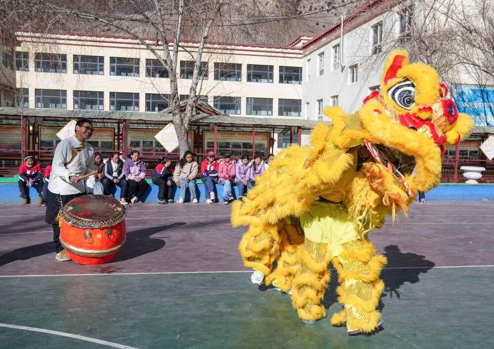 西藏昌都市洛隆县,舞狮队正在表演狮子舞。新华社记者 孙非 摄