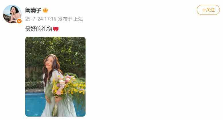 7月24日下午,演员阚清子在个人微博晒照并发文“最好的礼物”,官宣怀孕喜讯。