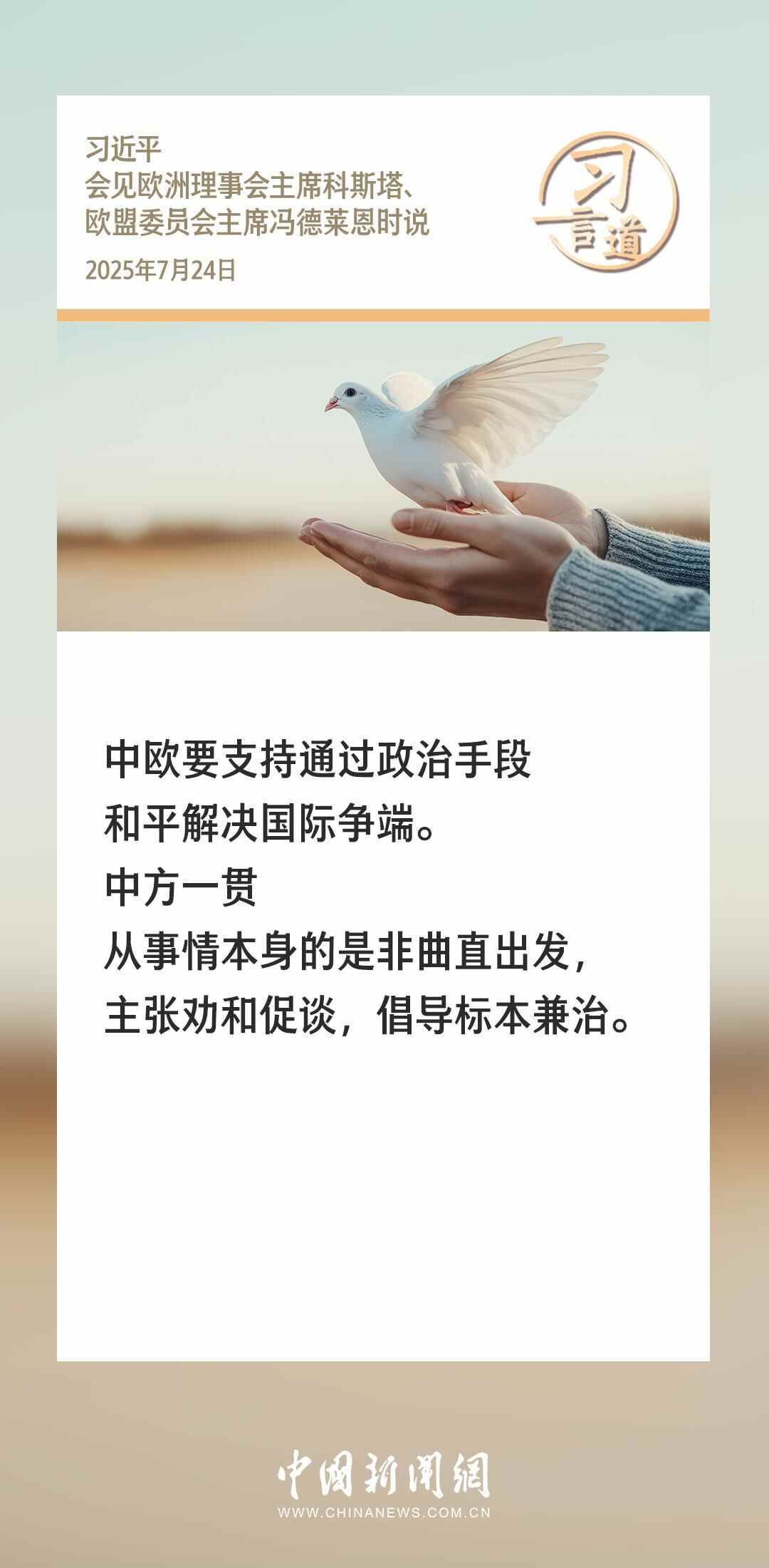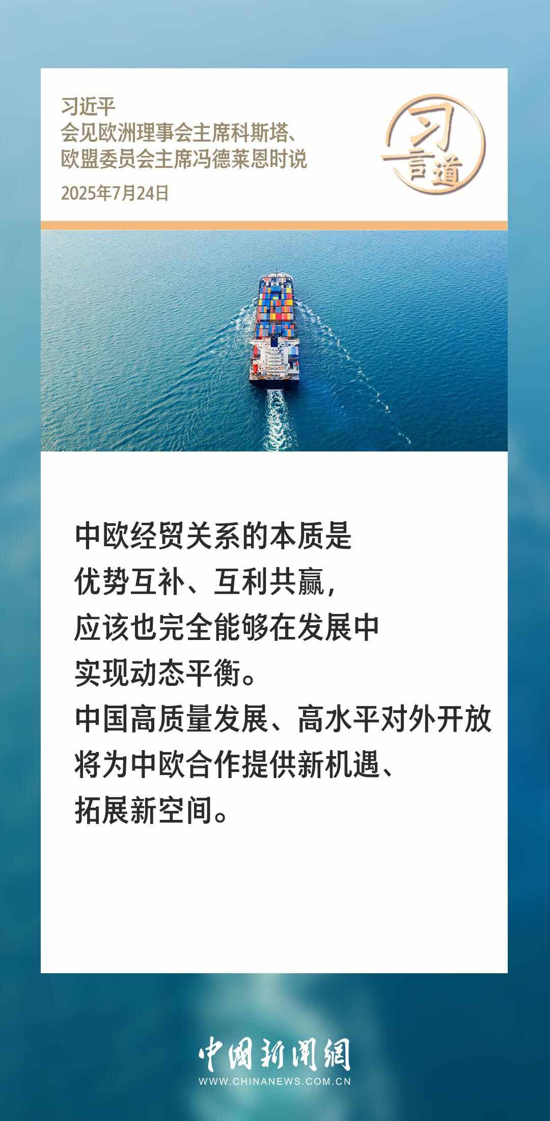 7月24日,国家主席习近平在北京人民大会堂会见来华举行第二十五次中国-欧盟领导人会晤的欧洲理事会主席科斯塔和欧盟委员会主席冯德莱恩。习近平指出——