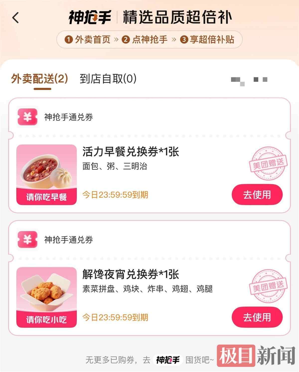 7月19日早上7时,记者打开美团外卖,只领取到1张活力早餐兑换券、1张解馋夜宵兑换券。