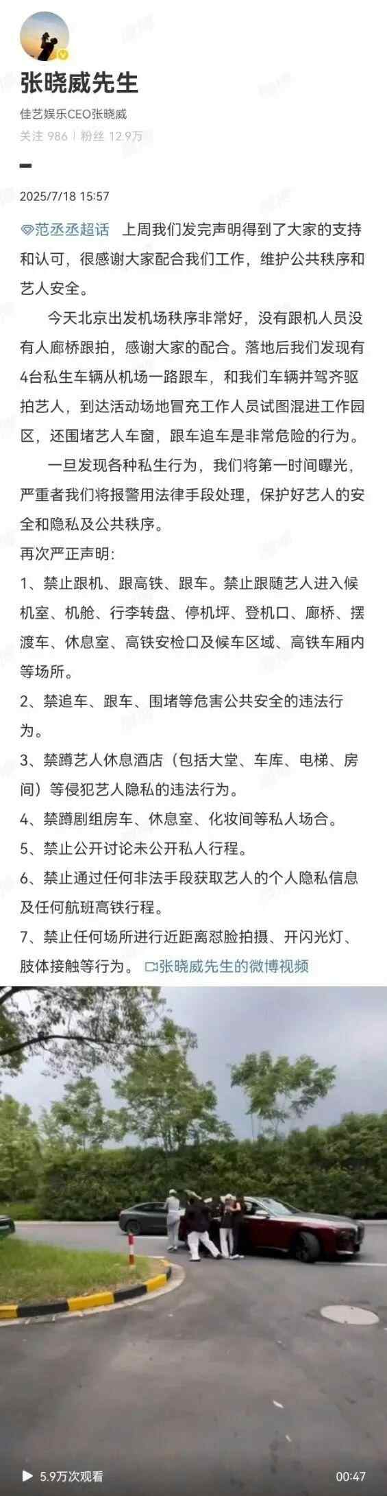 7月18日,男星范丞丞经纪人张晓威(鞋艺娱乐CEO)发布长文及视频,曝光4台私生车辆从北京机场一路尾随范丞丞工作车辆,途中多次拍摄、围堵车窗,甚至冒充工作人员试图混入工作园区。张晓威称,再有警告不听者,将堵车报警处理,绝不姑息。