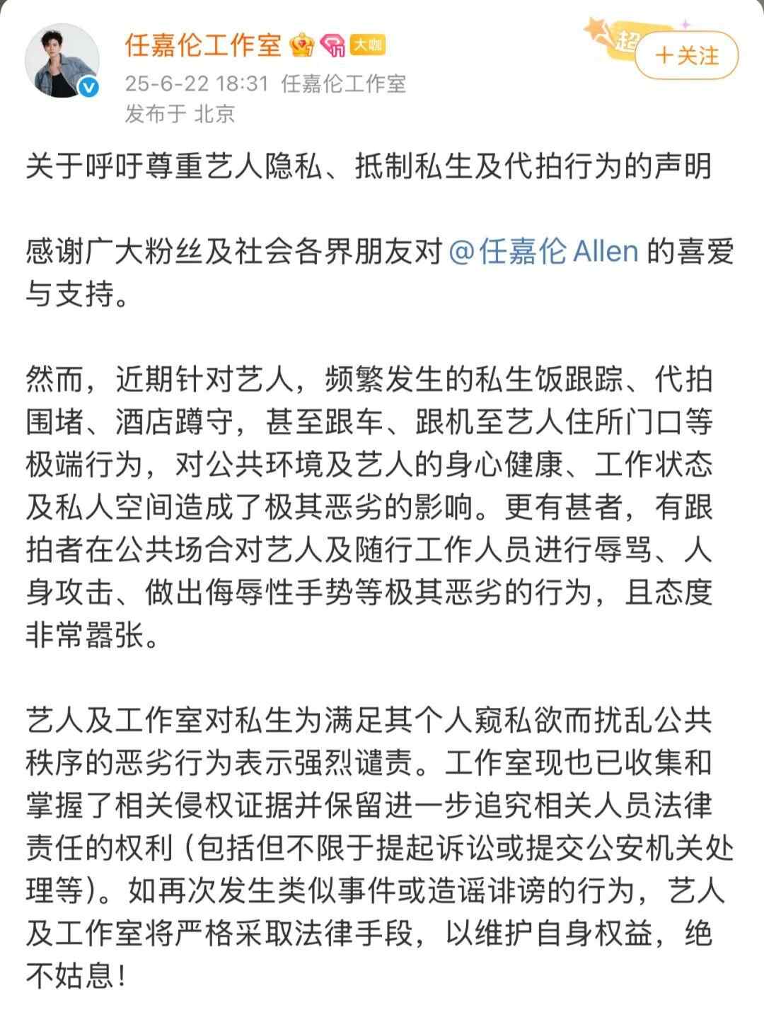 6月,男星任嘉伦工作室发布《关于呼吁尊重艺人隐私、抵制私生及代拍行为的声明》。声明称,近期针对艺人,频繁发生的私生饭跟踪、代拍围堵、酒店蹲守,甚至跟车、跟机至艺人住所门口等极端行为,对公共环境及艺人的身心健康、工作状态及私人空间造成了极其恶劣的影响。更有甚者,有跟拍者在公共场合对艺人及随行工作人员进行辱骂、人身攻击、做出侮辱性手势等极其恶劣的行为,且态度非常嚣张。工作室现也已收集和掌握了相关侵权证据并保留进一步追究相关人员法律责任的权利(包括但不限于提起诉讼或提交公安机关处理等)。