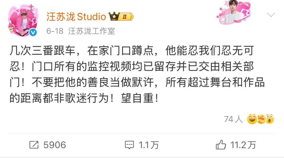 6月18日深夜,汪苏泷工作室通过官方微博,对近期频繁发生的跟车、蹲点等私生行为予以严厉谴责。工作室言辞犀利地表示,私生饭三番五次的跟车、家门口蹲守行为已突破底线,目前所有监控视频证据均已留存并移交相关部门,同时郑重警告:“不要把善意当作默许,超越舞台与作品的过度接触绝非歌迷应有的行为。”