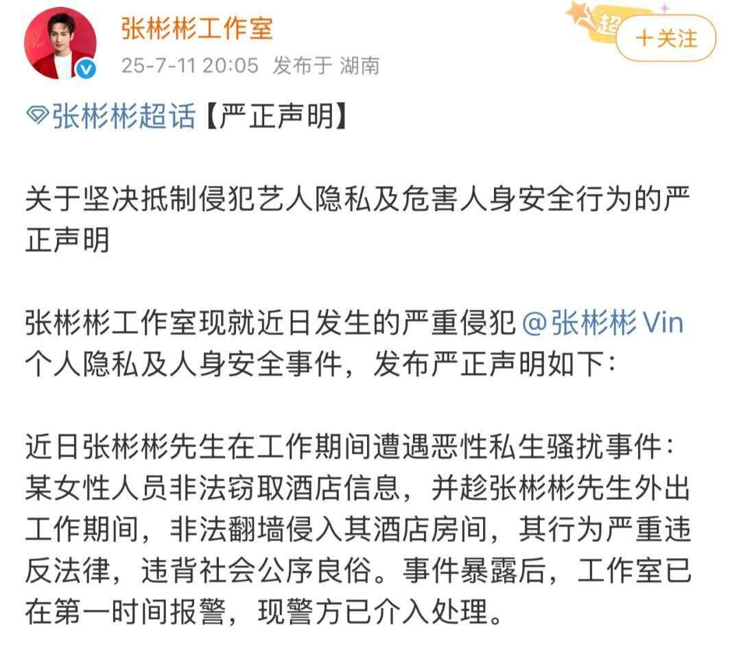 7月11日晚,演员张彬彬工作室发布“关于坚决抵制侵犯艺人隐私及危害人身安全行为的严正声明”。声明中称,近日张彬彬在工作期间遭遇恶性私生骚扰事件:某女性人员非法窃取酒店信息,并趁张彬彬外出工作期间,非法翻墙侵入其酒店房间,其行为严重违反法律,违背社会公序良俗。事件暴露后,工作室已在第一时间报警,现警方已介入处理。