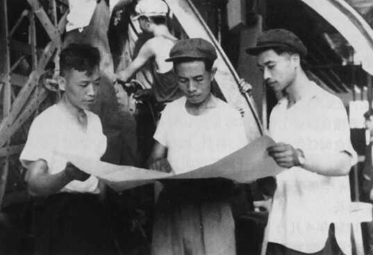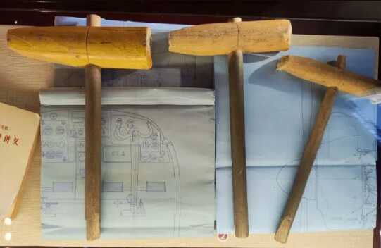 松陵机械厂工人陈阿玉用木榔头敲打校准
