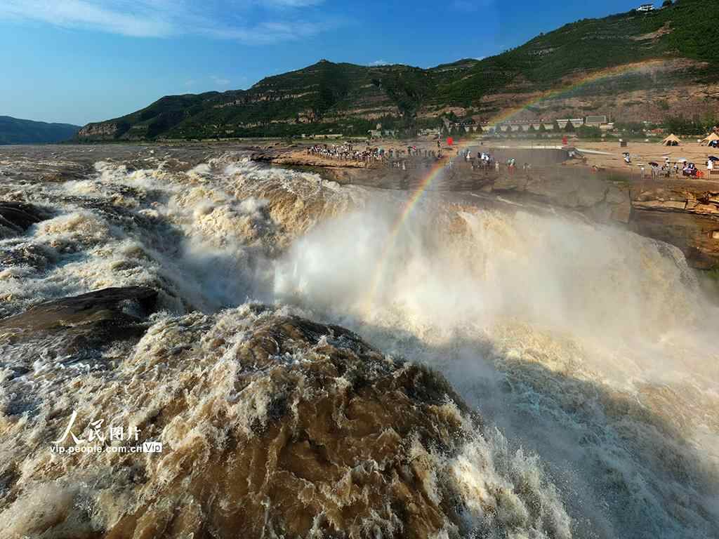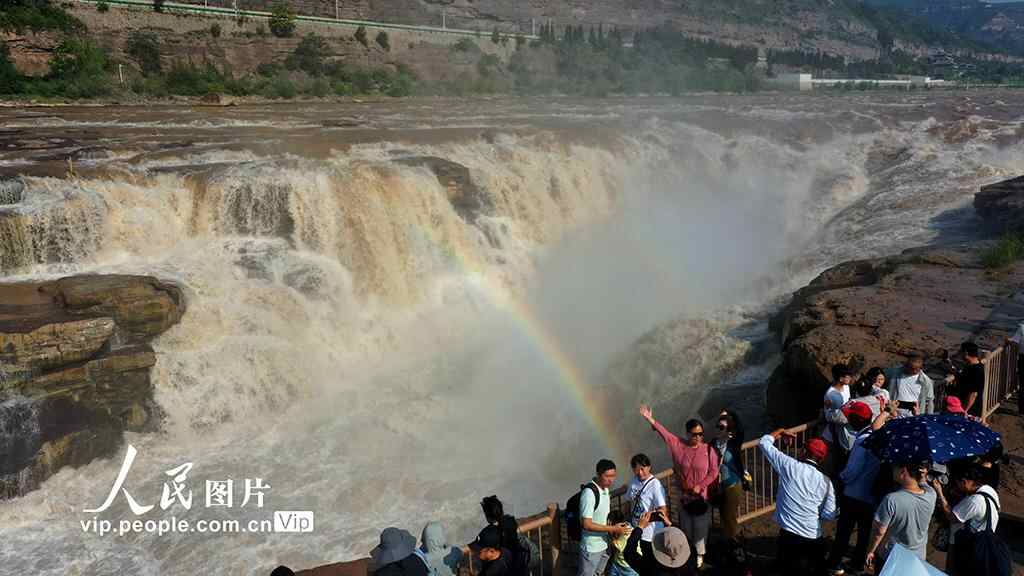 2025年7月18日,山西省临汾市吉县,众多游客在黄河壶口瀑布欣赏“彩虹桥”景观。吕桂明摄(人民图片网)