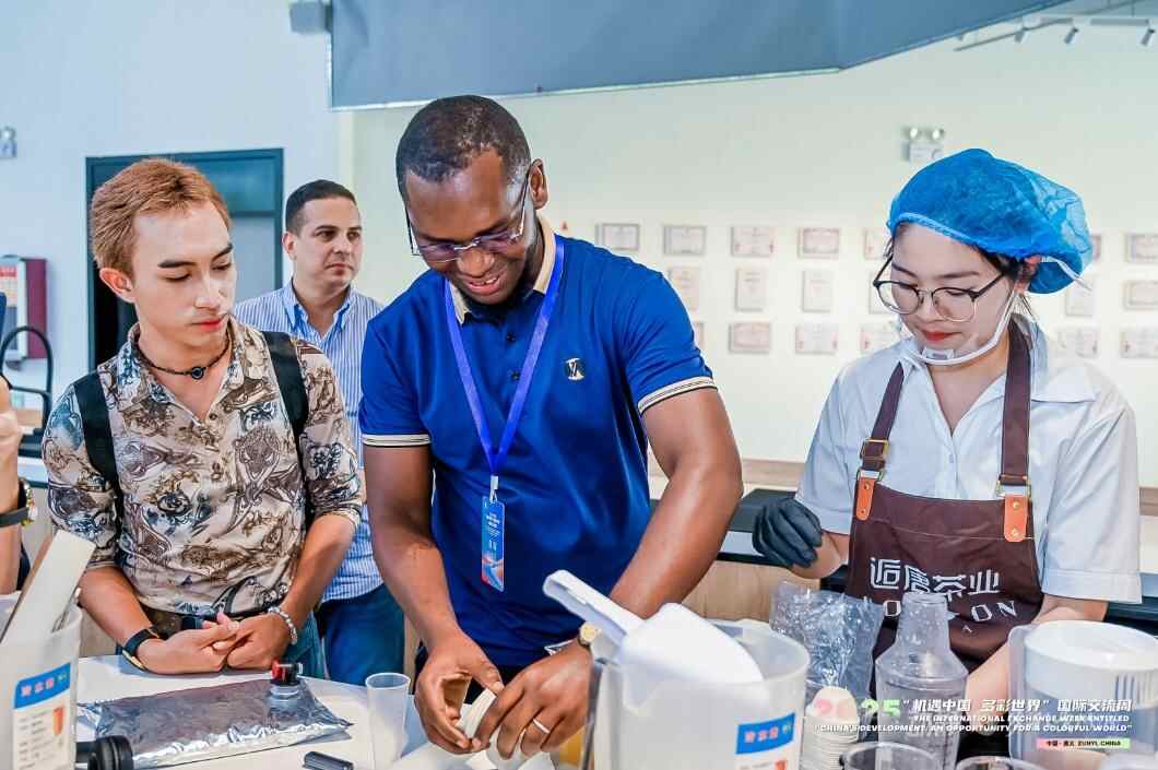在贵州逅唐茶业生物科技有限公司参访期间,冈比亚籍贵州大学森林培育专业在读博士Alagie Njie,试着以贵州茶为原材料自制了一份冰摇柠檬茶,“不但看到,还能亲身体验新茶饮的制作过程,喝到自己的作品,这感觉太美妙了!”