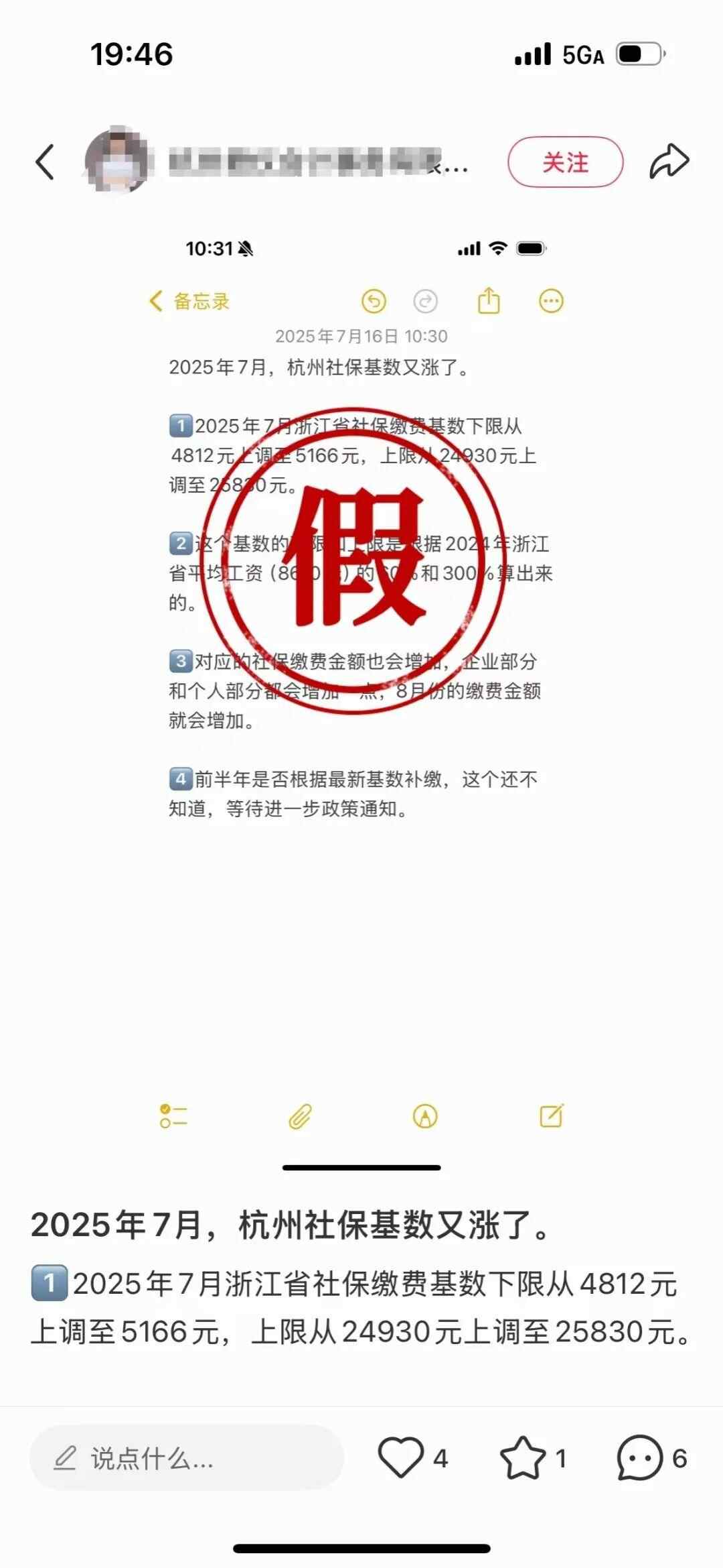 经核查,此为不实信息。杭州市人力社保局相关处室负责人表示,尚未接到上级关于调整今年社保缴费基数的通知,也没有开展缴费基数调整工作,相关信息以官方发布为准,切勿信谣传谣。