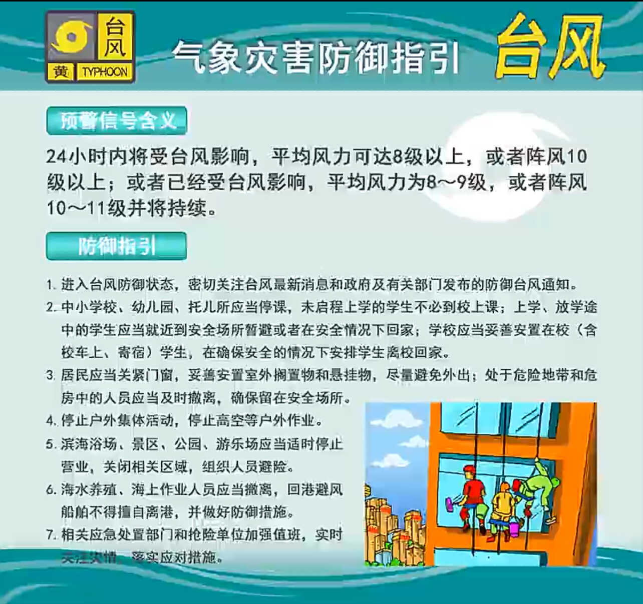 据悉,“停课信号”的发布,除了在学期期间提醒中小学校、幼儿园、托儿所应当停课,背后更大的意义在于提醒全体公众注意防御台风。按照广东省对台风黄色预警信号的指引,该信号发布意味着当地24小时内将受台风影响,平均风力可达8级以上,或者阵风10级以上;或者已经受台风影响,平均风力为8~9级,或者阵风10~11级并将持续。该信号的发布,意味着当地已进入台风防御状态,居民需密切关注台风最新消息和政府及有关部门发布的防御台风通知;居民应当关紧门窗,妥善安置室外搁置物和悬挂物,尽量避免外出;处于危险地带和危房中的人员应当及时撤离,确保留在安全场所;停止户外集体活动,停止高空等户外作业;滨海浴场、景区、公园、游乐场应当适时停止营业,关闭相关区域,组织人员避险;海水养殖、海上作业人员应当撤离,回港避风船舶不得擅自离港,并做好防御措施;相关应急处置部门和抢险单位加强值班,实时关注灾情,落实应对措施。