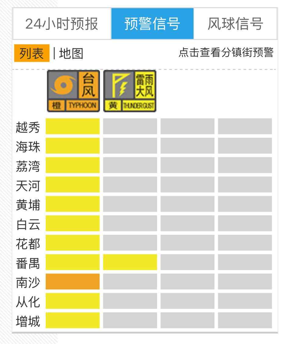 截至7月19日16时20分,广州市越秀、天河、海珠、荔湾、黄埔、番禺、南沙、增城等区,均已发布代表“停课信号”的台风黄色预警信号。随着台风“韦帕”进一步移近,不排除广州其余行政区继续升级或调整预警信号的可能。