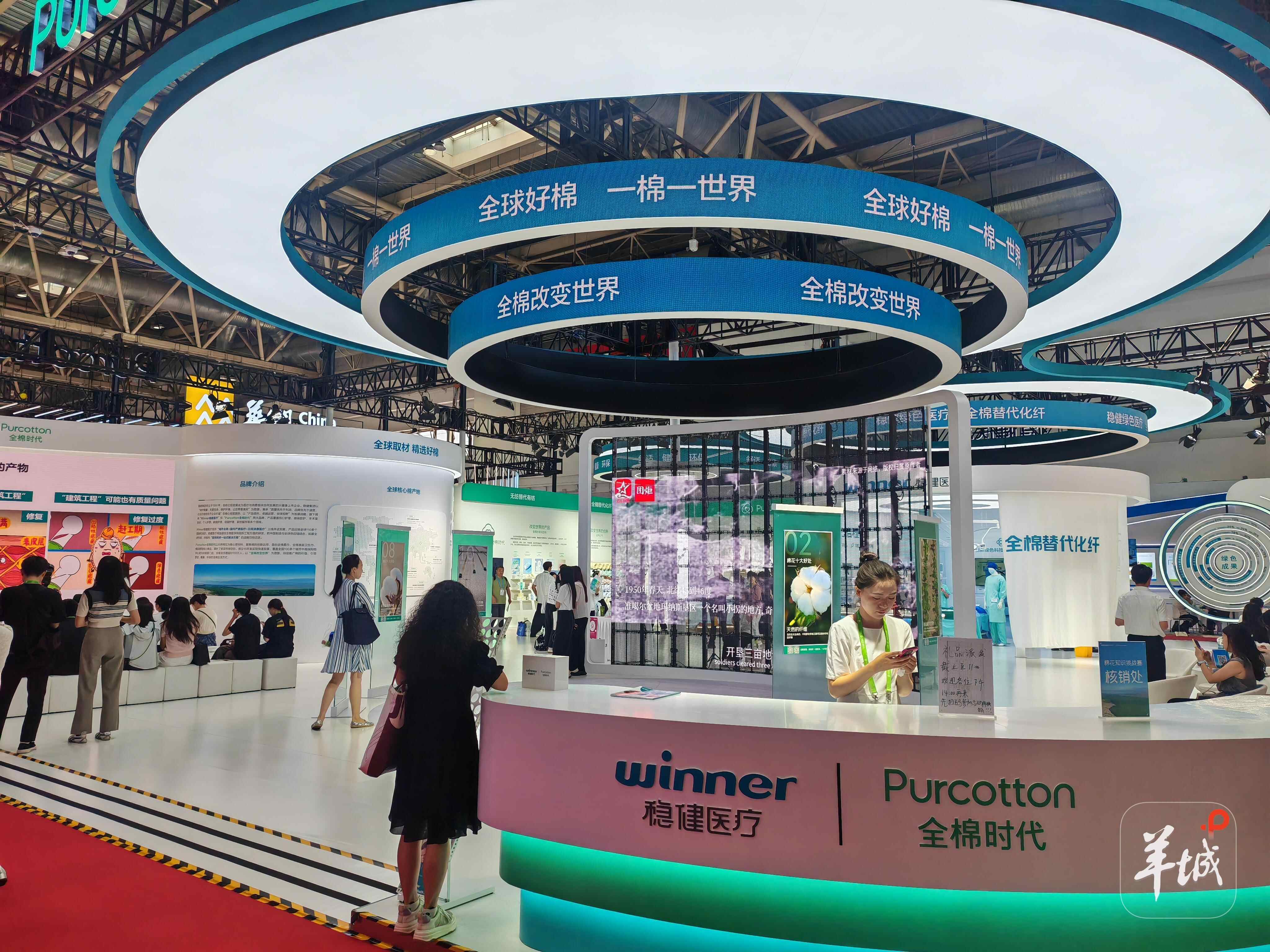 在健康生活链展区,稳健医疗与全棉时代展区以“全球好棉,一棉一世界”为主题,将绿色理念贯穿种植、生产、流通各环节,以创新技术与产品推动可持续发展,为全球供应链注入“棉花的绿色动能”。数据显示,稳健医疗成立至今,采购棉花累计约100万吨,涉及种植基地1500亩;全棉时代棉柔巾累计售出超过786.7亿张,可环绕地球393.4圈,减少大量树木砍伐,保护地球生态。