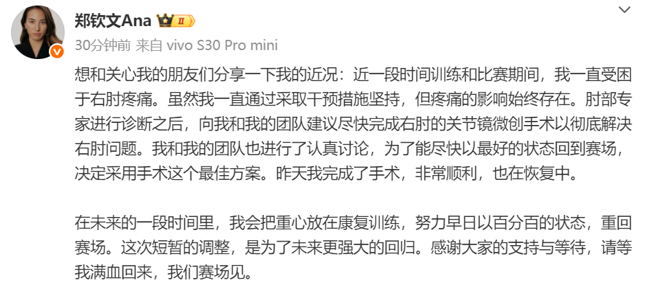 郑钦文写道:“近一段时间训练和比赛期间,我一直受困于右肘疼痛。虽然我一直通过采取干预措施坚持,但疼痛的影响始终存在。肘部专家进行诊断之后,向我和我的团队建议尽快完成右肘的关节镜微创手术以彻底解决右肘问题。我和我的团队也进行了认真讨论,为了能尽快以最好的状态回到赛场,决定采用手术这个最佳方案。昨天我完成了手术,非常顺利,也在恢复中。在未来的一段时间里,我会把重心放在康复训练,努力早日以百分百的状态,重回赛场。这次短暂的调整,是为了未来更强大的回归。感谢大家的支持与等待,请等我满血回来,我们赛场见。”
