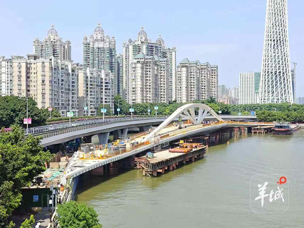 日前,随着最后一段钢梁吊装到位,连接广州塔和琶洲西区的黄埔涌步行桥顺利合龙,桥梁主体结构施工取得决定性进展。7月19日,羊城晚报记者走访看到,工人们正在有序施工。