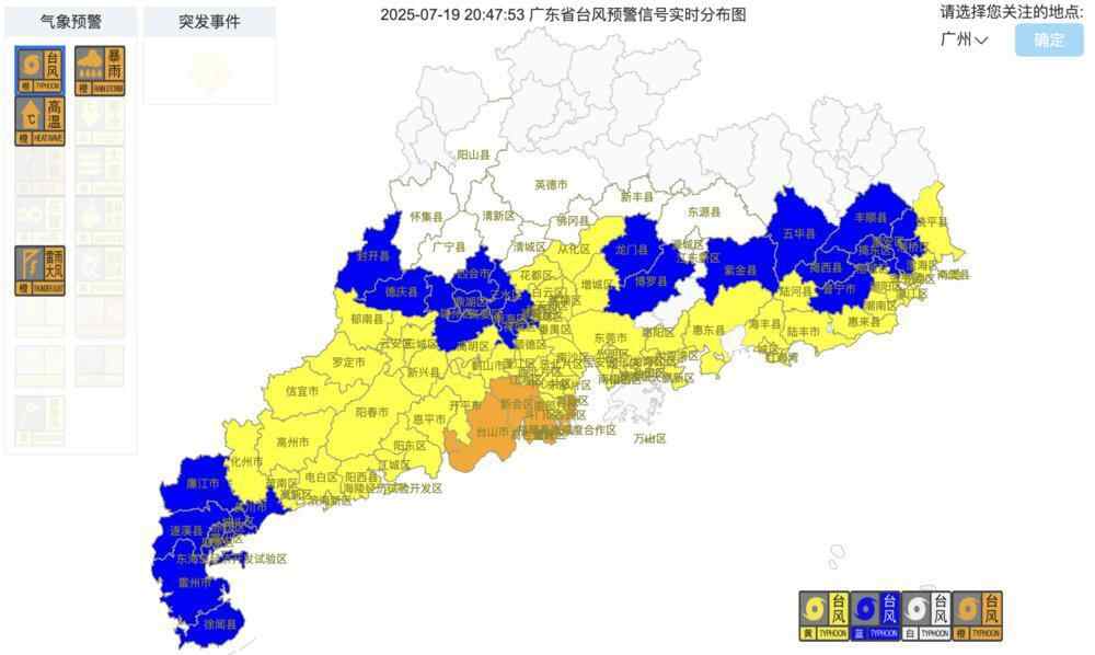 今年第6号台风“韦帕”继续向广东移近。截至7月19日20时47分,珠海,江门台山、新会等地,已将台风黄色预警信号升级至橙色。随着“韦帕”进一步移近,不排除广东继续有相关市县区升级或调整台风预警信号。