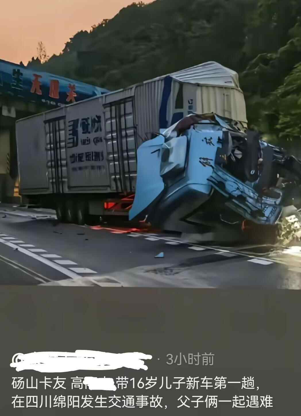 近日,多位网友在社交平台上发信息称,7月17日凌晨,安徽省宿州市砀山县卡车司机高师傅带16岁儿子出车,在京昆高速四川绵阳段发生交通事故,父子二人均不幸遇难。