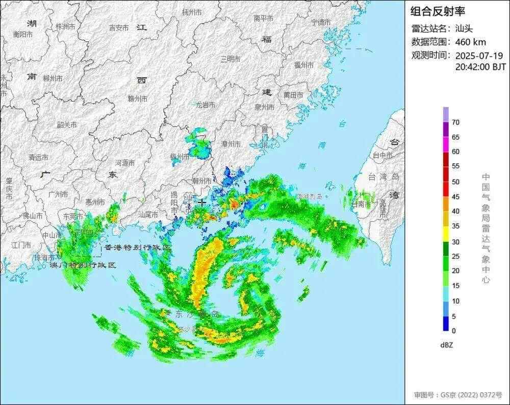 7月19日20时42分,台风“韦帕”的雷达影像 中国气象局雷达气象中心汕头雷达图