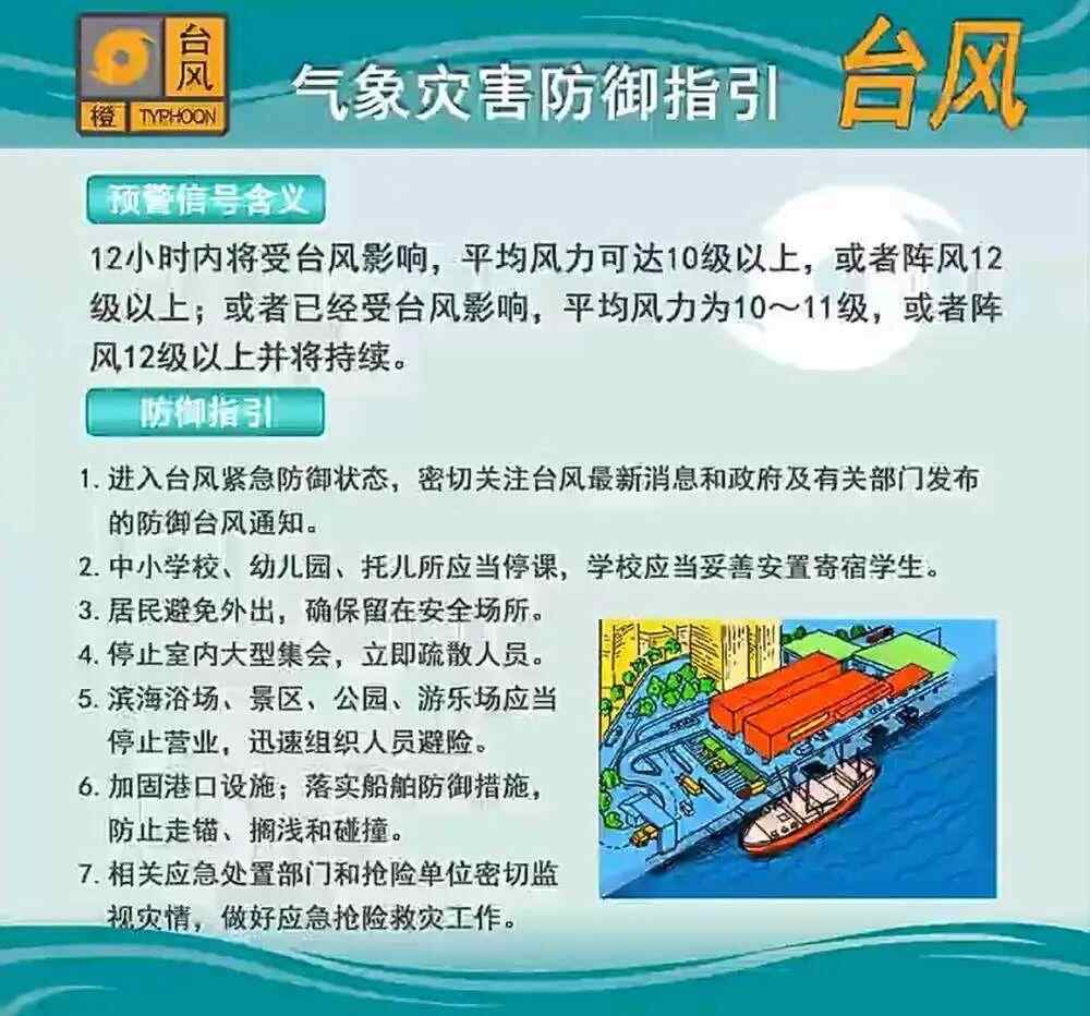 根据台风橙色预警信号含义,该信号发布的地方,12小时内将受台风影响,平均风力可达10级以上,或者阵风12级以上;或者已经受台风影响,平均风力为10~11级,或者阵风12级以上并将持续。发布台风橙色预警信号的地区,进入台风紧急防御状态,公众需密切关注台风最新消息和政府及有关部门发布的防御台风通知。中小学校、幼儿园、托儿所应当停课,学校应当妥善安置寄宿学生。居民避免外出,确保留在安全场所。停止室内大型集会,立即疏散人员。滨海浴场、景区、公园、游乐场应当停止营业,迅速组织人员避险。加固港口设施;落实船舶防御措施,防止走锚、搁浅和碰撞。相关应急处置部门和抢险单位密切监视灾情,做好应急抢险救灾工作。