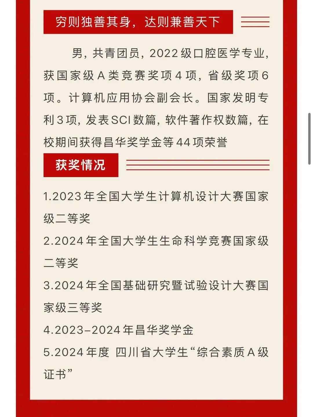 网传消息及众多知情人士透露,该PPT介绍的对象,正是川北医学院本科生罗某。据川北医学院微信公众号显示,罗某就读于该校口腔医学院,是2022级学生。2025年5月,他曾获学校2024年度青年五四奖章,在获奖介绍中提到,他有国家级A类竞赛奖项4项,省级奖项6项。计算机应用协会副会长。国家发明专利3项, 发表SCI数篇,软件著作权数篇,在校期间获得昌华奖学金等44项荣誉……