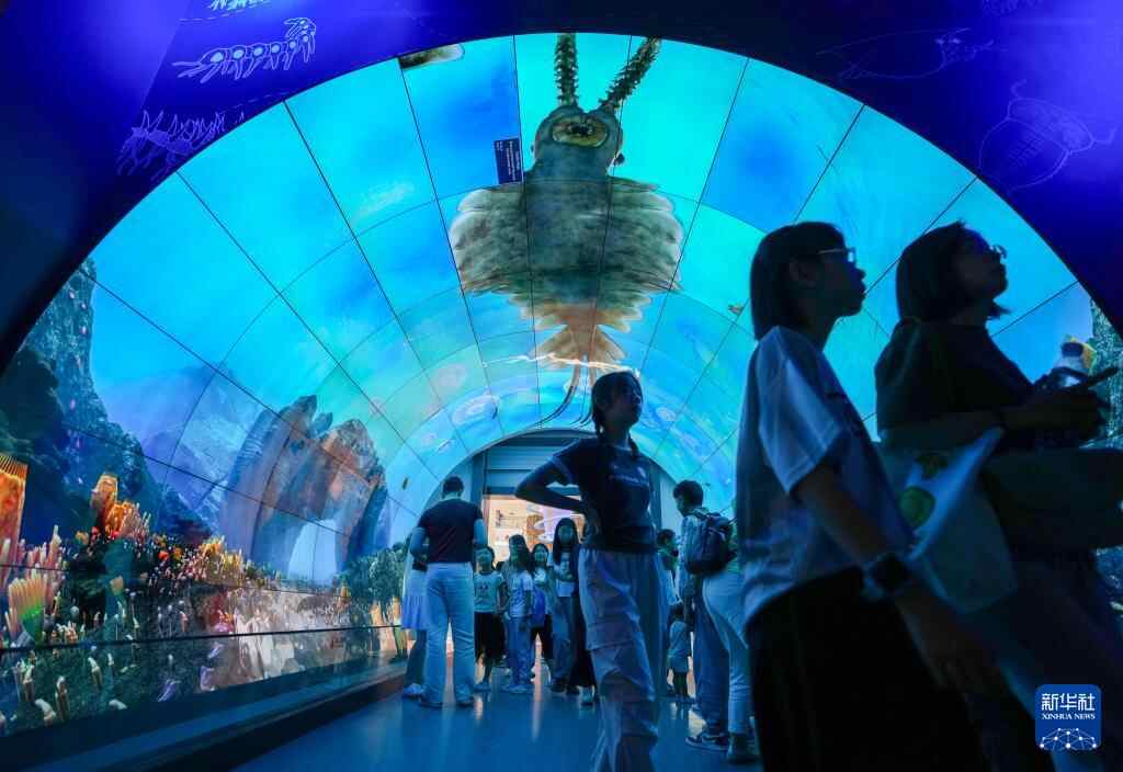 7月15日,游客在澄江化石地世界自然遗产博物馆“寒武纪海底隧道”参观。
