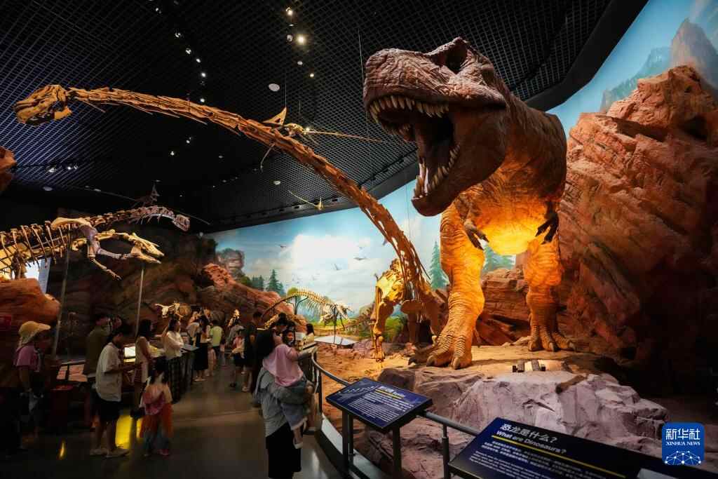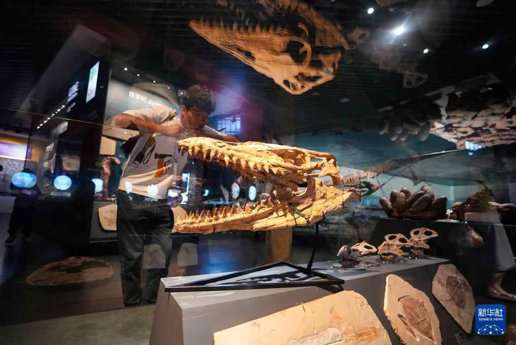 7月15日,游客在澄江化石地世界自然遗产博物馆体验镰刀龙体感互动项目。