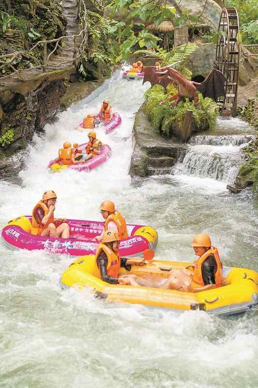 在清远,不少外地游客的旅游行程和“清远——漂流奇趣亲子之旅”线路里推荐一模一样。7月13日,来自湖南长沙的张女士一家说,他们第一天去了清远长隆游玩,住在长颈鹿城堡酒店,第二天来到清远古龙峡准备体验漂流、云天波霸、悬崖飞车、QQ飞车等项目,接着傍晚再坐高铁返程。