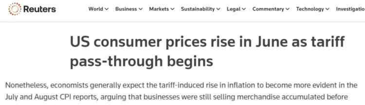 用摩根士丹利财富管理公司首席经济策略师艾伦•曾特纳的话说,“通胀已开始出现关税传导的初步迹象”,6月CPI数据“可能是未来更大价格压力的第一个信号”。
