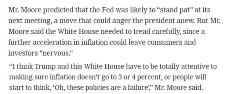 美国保守派经济学家、特朗普的前顾问斯蒂芬·摩尔表示,虽然6月CPI报告“不错”,但仍然表明“与通胀的斗争尚未结束”。因此白宫需要谨慎行事,因为通胀进一步加剧可能会让消费者和投资者感到“紧张”。