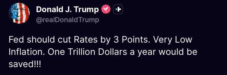 他15日在社交媒体上发帖称,由于“通胀率较低”,美联储应该降息3个百分点,这样“一年可以省下一万亿美元”。