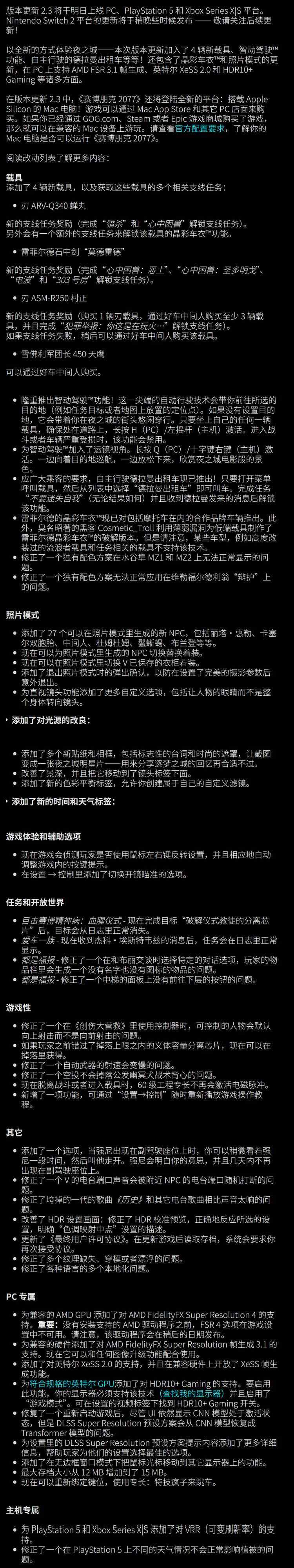《赛博朋克2077》2.3版本免费更新今日上线。新增4辆载具、智动驾驶功能、自主行驶的德拉曼出租车、晶彩车衣和照片模式更新等内容。PC端支持AMD FSR 3.1 帧生成、英特尔 XeSS 2.0 和 HDR10+ Gaming等。 “当强尼出现在副驾驶座位上时,你可以稍微看着强尼一段时间,然后叫他走开。强尼会明白你的意思,并且几天内不再出现在副驾驶座位上。”