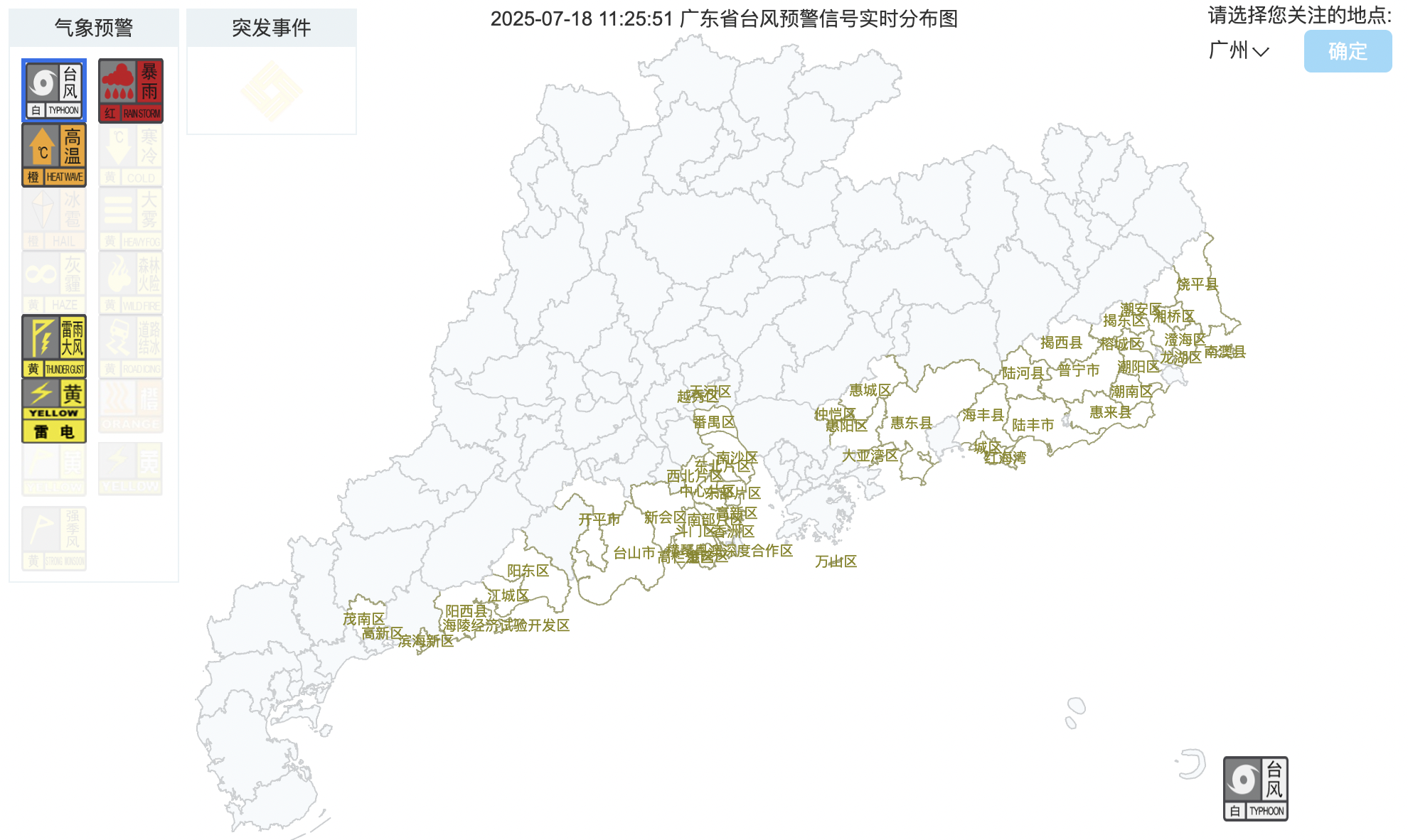 根据广东省气象部门统计,截至7月18日11时25分,广东已有超过30个预警区域发布台风白色预警信号,覆盖潮州、汕头、揭阳、汕尾、惠州、广州、中山、珠海、江门、阳江、茂名等市的市县区。与此同时,珠江口东部在7月18日上午受强雷雨天气影响,深圳多个行政区发布暴雨红色预警信号,东莞、惠州仲恺区发布暴雨黄色预警信号。