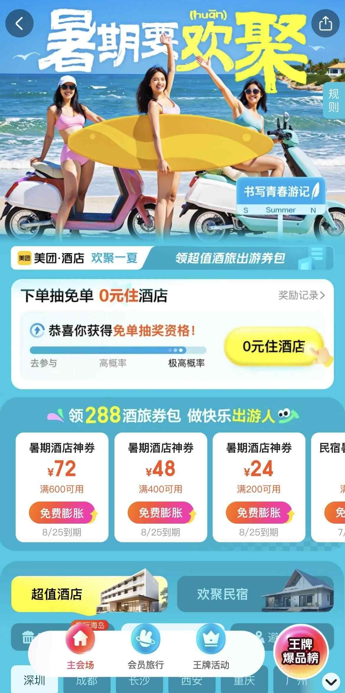 以江苏为例,“跟着苏超逛江苏”活动覆盖平台当地千余家景点及数万家酒店、餐饮、足疗、洗浴,拉动江苏暑期文旅预订量已同比增长41%;与海南省旅游和文化广电体育厅联手打造的“清凉一夏·海南度假”消费券项目,让海南暑期文旅增速同比上涨62%,当地五星酒店同期预订增速达80%。